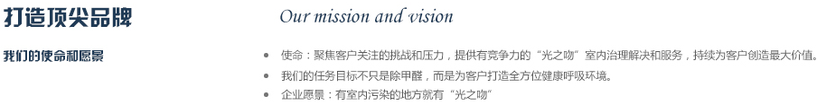 2012年公司斥巨資從德國專業空氣研發實驗室引進銳鈦型納米二氧化鈦研發成果,同時與國內知名高校進行合作,成立光之吻”品牌,致力于為人類創作純凈,健康的呼吸環境,成為你身邊的健康衛士,實現365天健康呼吸的夢想,目前是同類產品中最有競爭力的品牌之一。